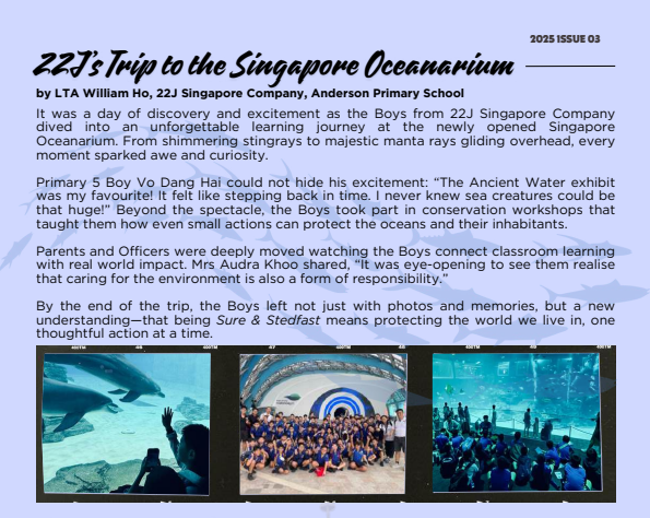 In 2022, they visited SEA Aquarium and in 2023, it was a trip to the newly opened Bird Paradise. In 2024, it is another unforgettable learning journey to the Singapore Zoo. Newly renovated Oceanarium was the next destination in 2025. During the learning journey, they were immersed in outdoor education learning about the natural world around them. The Boys moved in squads and had a delightful time of team bonding and looking out for each other.