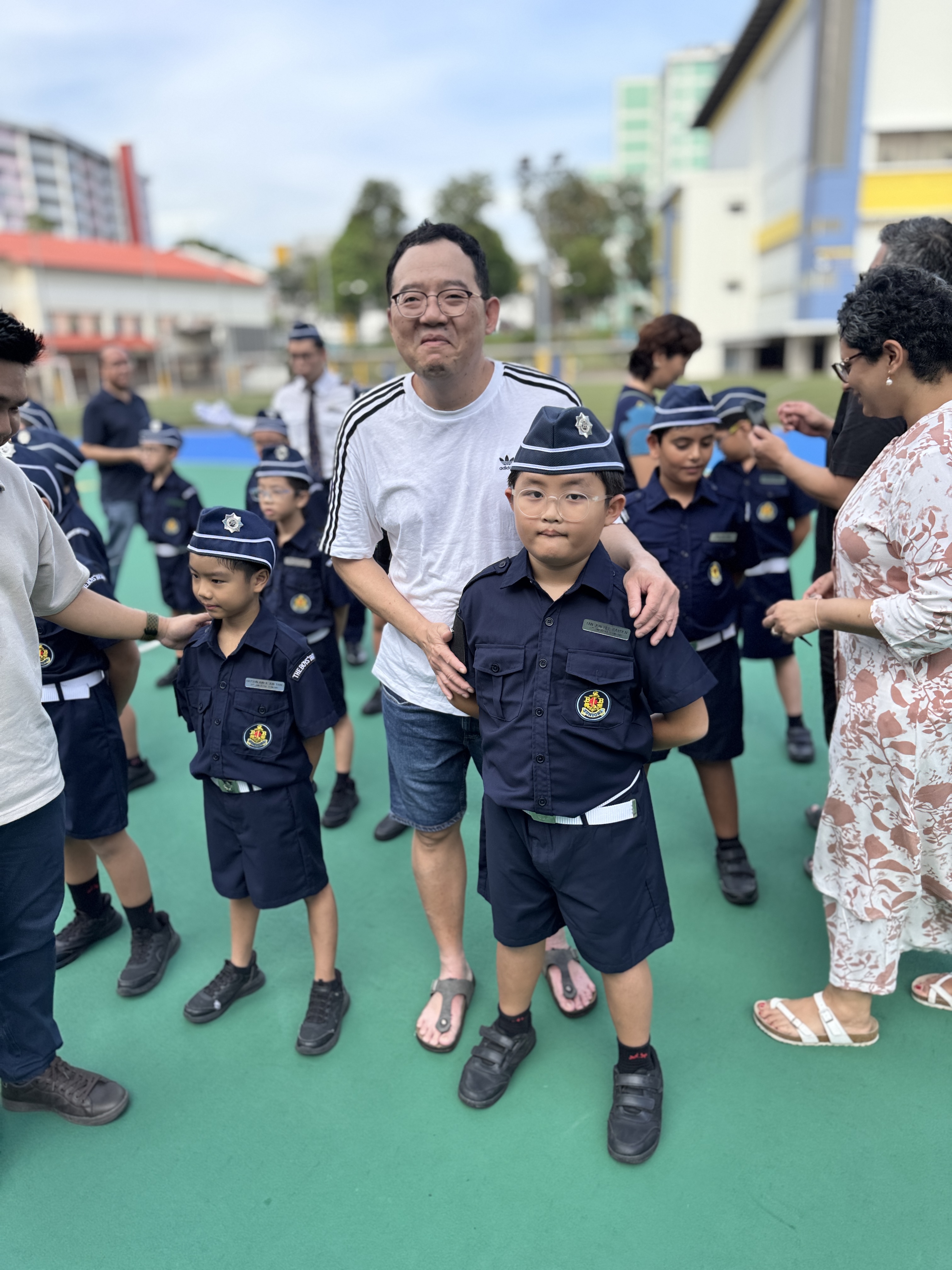 Proud parents putting on the first badge for their sons