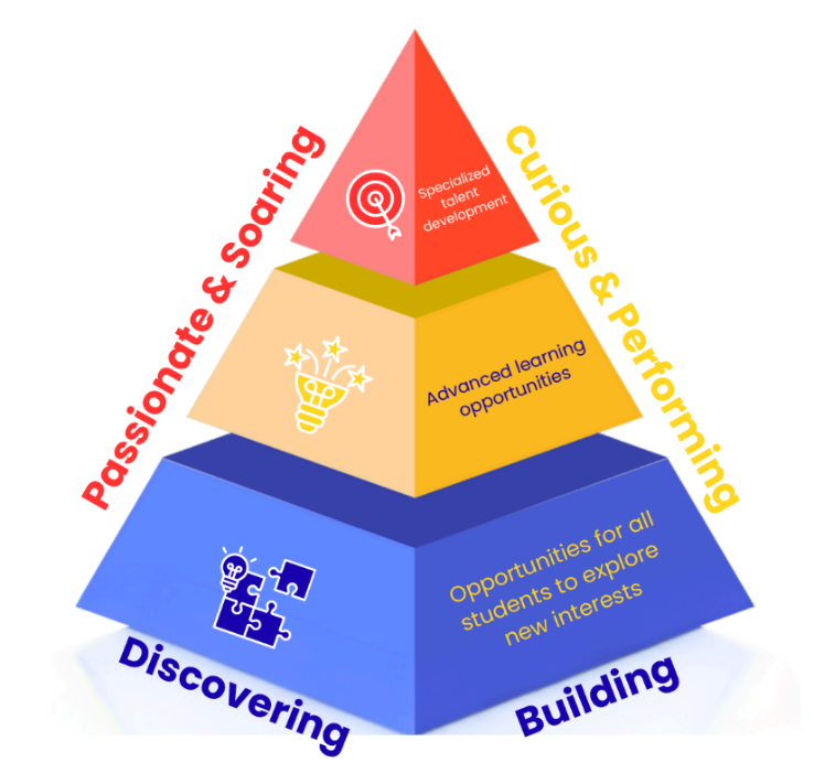At the foundation, all students are provided with a range of opportunities to discover and build new interests, developing students’ innate sense of curiosity and joy of learning. The next level offers advanced learning opportunities that deepen skills and understanding for students ready to be further challenged. At the peak, specialised talent development supports students in pursuing their strengths at a higher level, enabling them to soar with passion and purpose.